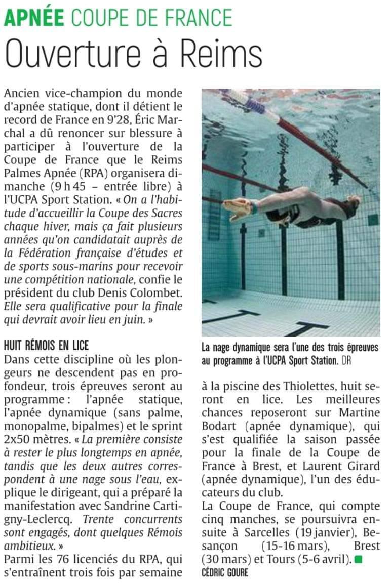 Les rémois(e)s sont allées chercher quelques médailles avec en dynamique bi palmes: Jane 150m et Martine 141.3m. Fred s'offre une belle deuxième place avec 54sec au 2X50m et enfin Martine réalise 4min52 en statique et monte sur la deuxième marche. Félicitations!